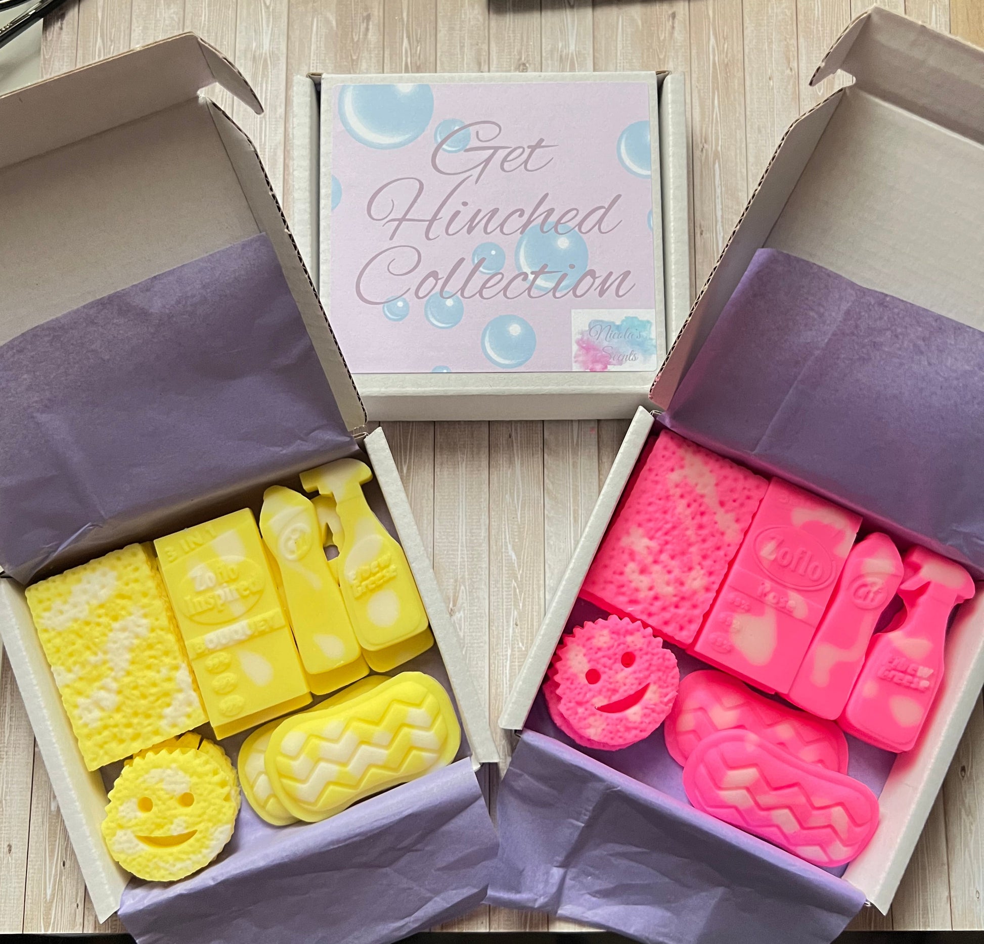 Our Get Hinched box of shapes come in one scent only and will contain 12 shapes weighing approximately 100g per bag, this differs slightly from box to box due to being hand poured. The weight is an approximate weigh for the product in total.