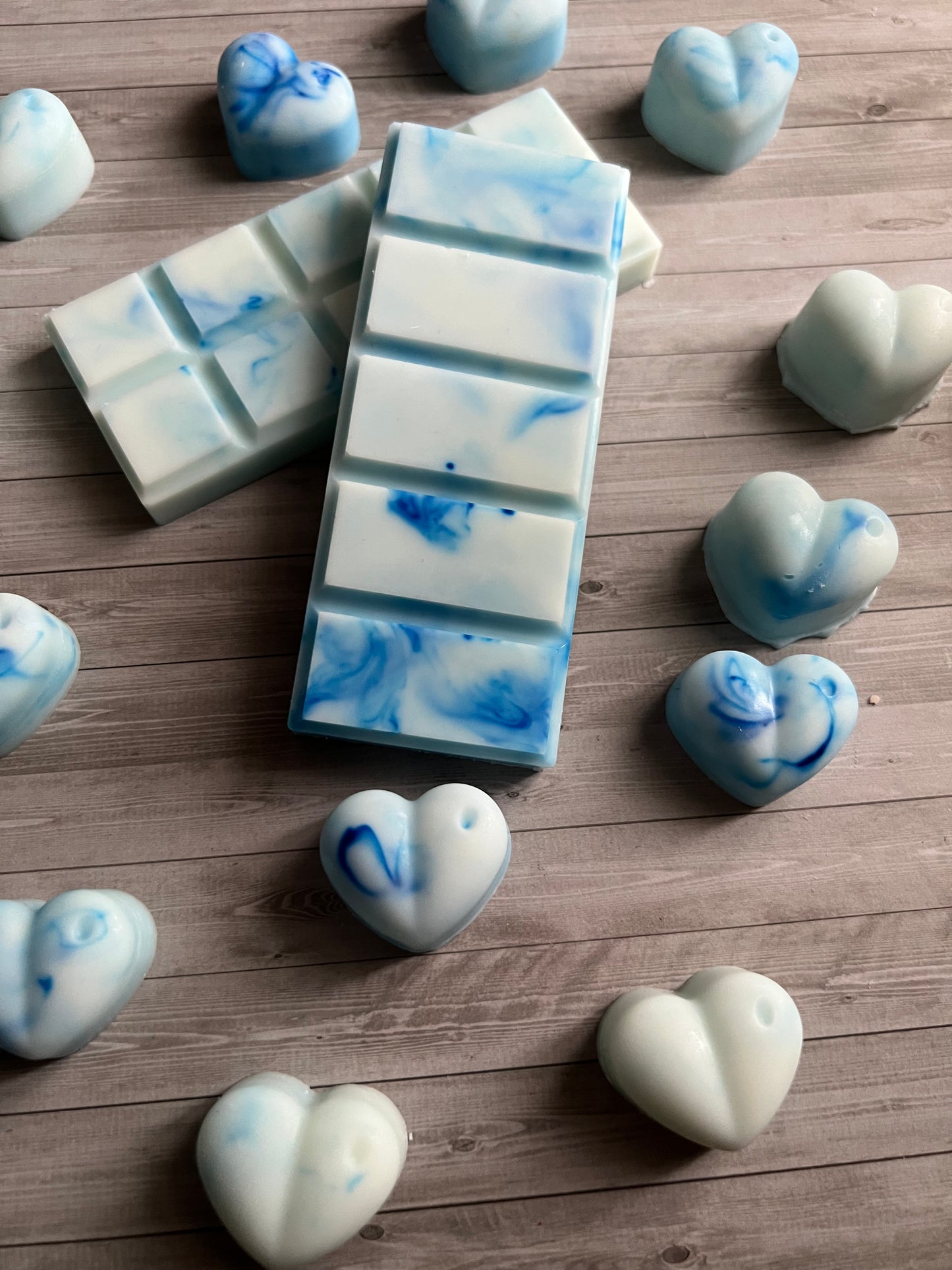 Our sample shapes will vary, we mainly use hearts but can be other shapes too that all weigh approximately 7g each and our snap bars either come in 5 or 10 segment bars chosen at random depending on which are made and each weigh between 40g & 45g per bar, this differs slightly from bar to bar due to being hand poured.